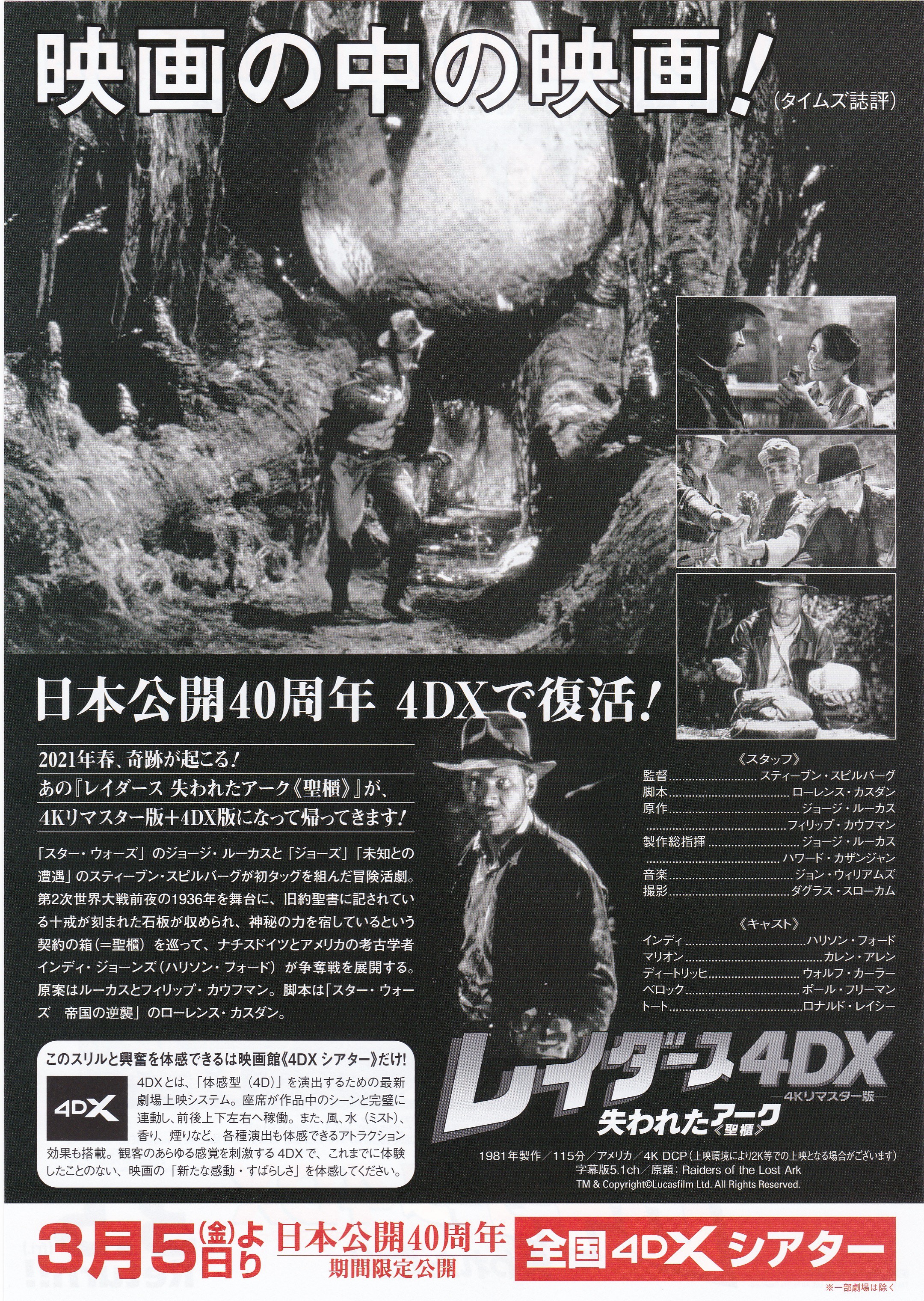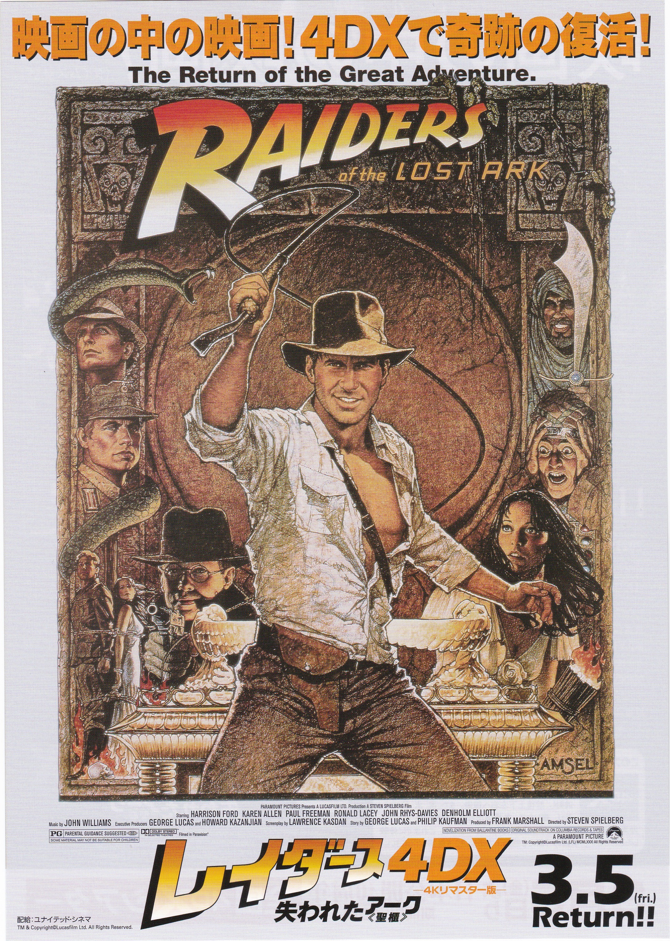 1981년( 한국은 1982년 )에 개봉했던 "레이더스 ( Raiders、レイダース ) 잃어버린 성궤"를 찾아서가 2021년 40주년을 기념해 4DX(4K Remaster)로 재개봉합니다.