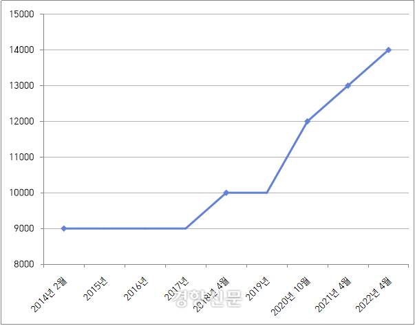 2014년 부터 2022년 현재까지 8년간 150%의 가격이 되었지만 ( 5,000원이 올랐습니다. )