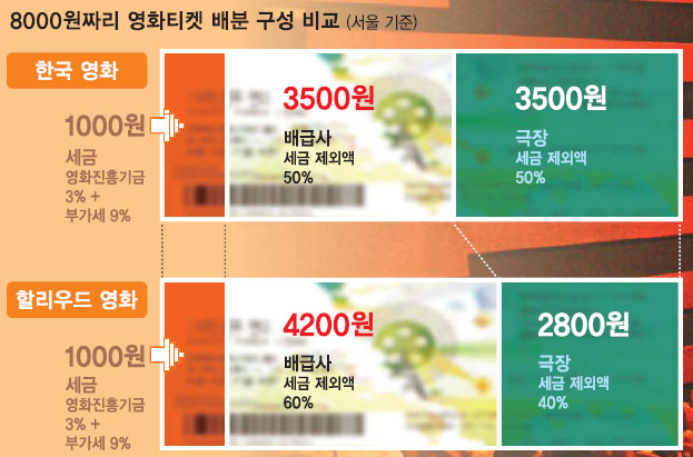 세금을 제외한 금액에서 한국 영화의 경우는 배급사와 극장이 5:5, 할리우드 영화의 경우는 6:4로 수익을 나누네요.
